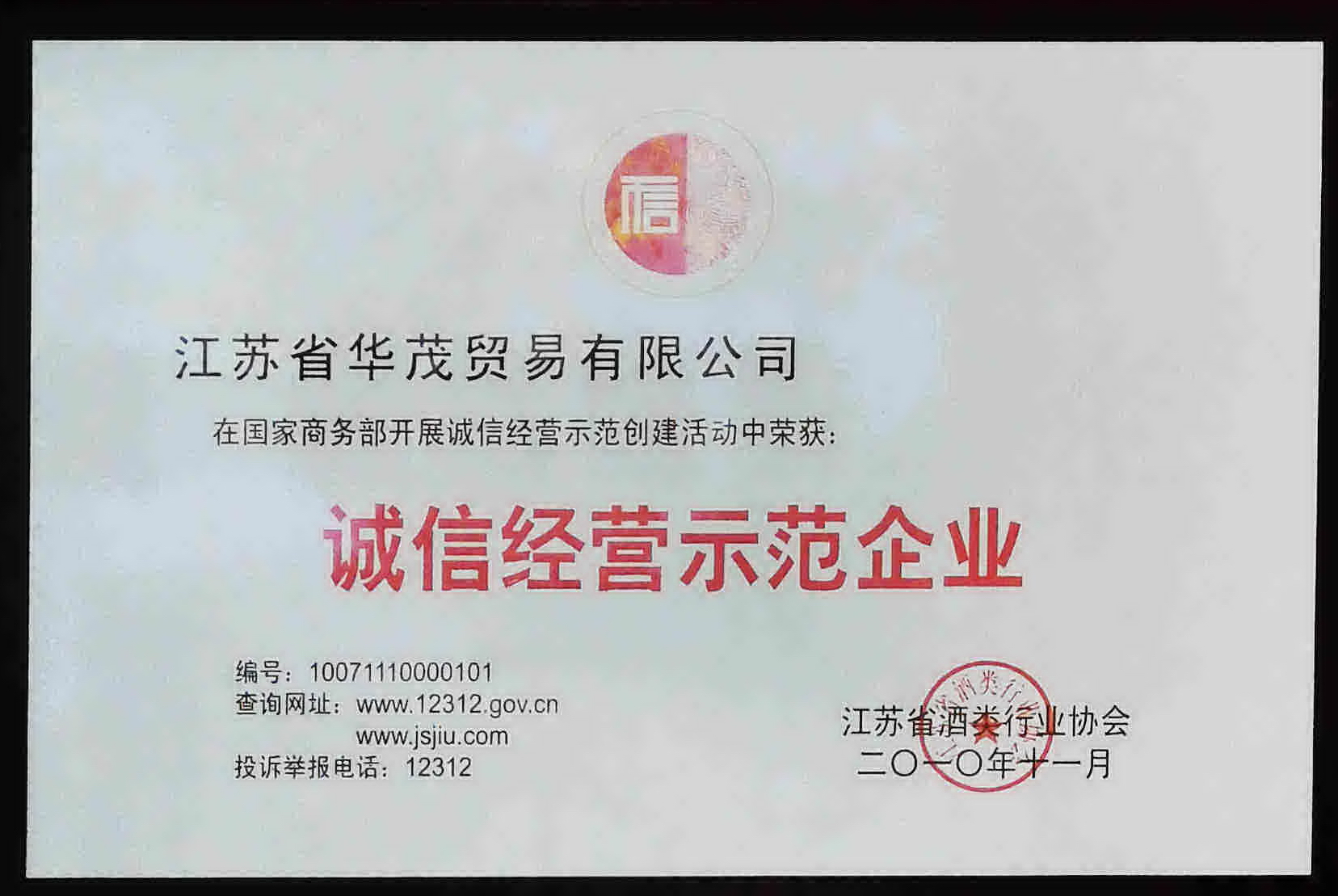 2010年獲中國酒類行業(yè)協(xié)會頒發(fā)“誠信經(jīng)營示范企業(yè)”稱號
